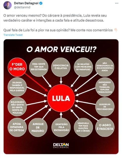 Na nova versão, o ex-deputado coloca o presidente Lula, novamente, no centro de uma imagem. “O amor venceu mesmo? Do cárcere à presidência, Lula revela seu verdadeiro caráter e intenções a cada fala e atitude desastrosa. Qual fala de Lula foi a pior na sua opinião?”, escreveu Dallagnol.