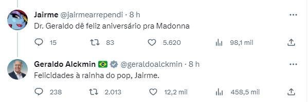 Geraldo Alckmin (PSB) não deixou o aniversário de 65 anos da cantora Madonna passar em branco e usou suas redes sociais, nesta quarta-feira (16/8), para deixar suas felicitações à Rainha do Pop.
