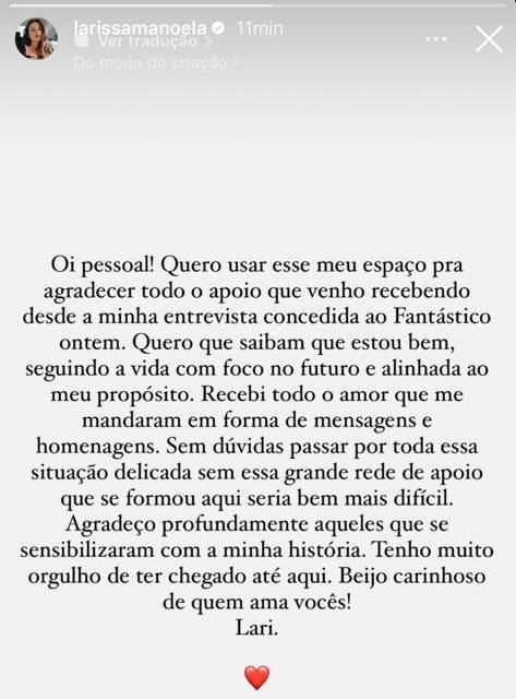 Larissa Manoela usou as redes sociais para falar com os fãs sobre o caso polêmico com os pais. Após a repercussão da matéria exibida no Fantástico no último domingo (13/8), a atriz resolveu agradecer o apoio que vem recebendo.