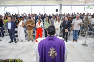 O governador Ibaneis Rocha e a primeira-dama Mayara Noronha Rocha participaram da missa de Ação de Graças no Palácio do...