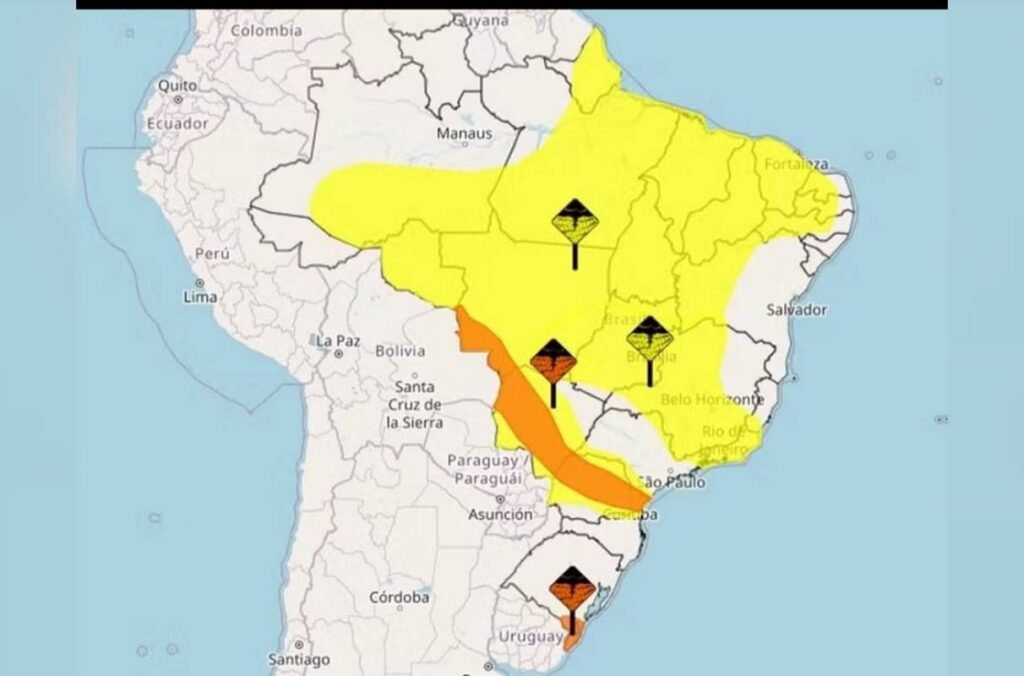Partes dos estados de Mato Grosso e Mato Grosso do Sul, o extremo sul gaúcho e a faixa central do Paraná estão sob alertas de chuvas intensas, regiões nas quais pode chover até 100 mm. Chuvas de menor intensidade, contudo, também devem atingir todo o restante da porção central do país.