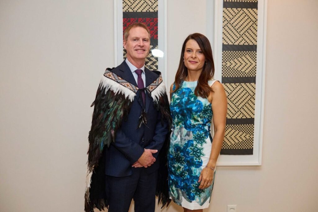A noite teve início com um Karangaum, um poderoso canto cerimonial usado para cumprimentar os convidados, simbolizando respeito, hospitalidade e a conexão com os anfitriões. Além de um ambiente que exalava cultura, o embaixador Richard Prendergast fez questão de estar vestido à altura do evento, e se apresentou usando um Kākahu, uma imponente capa tradicional, símbolo de prestígio e respeito.