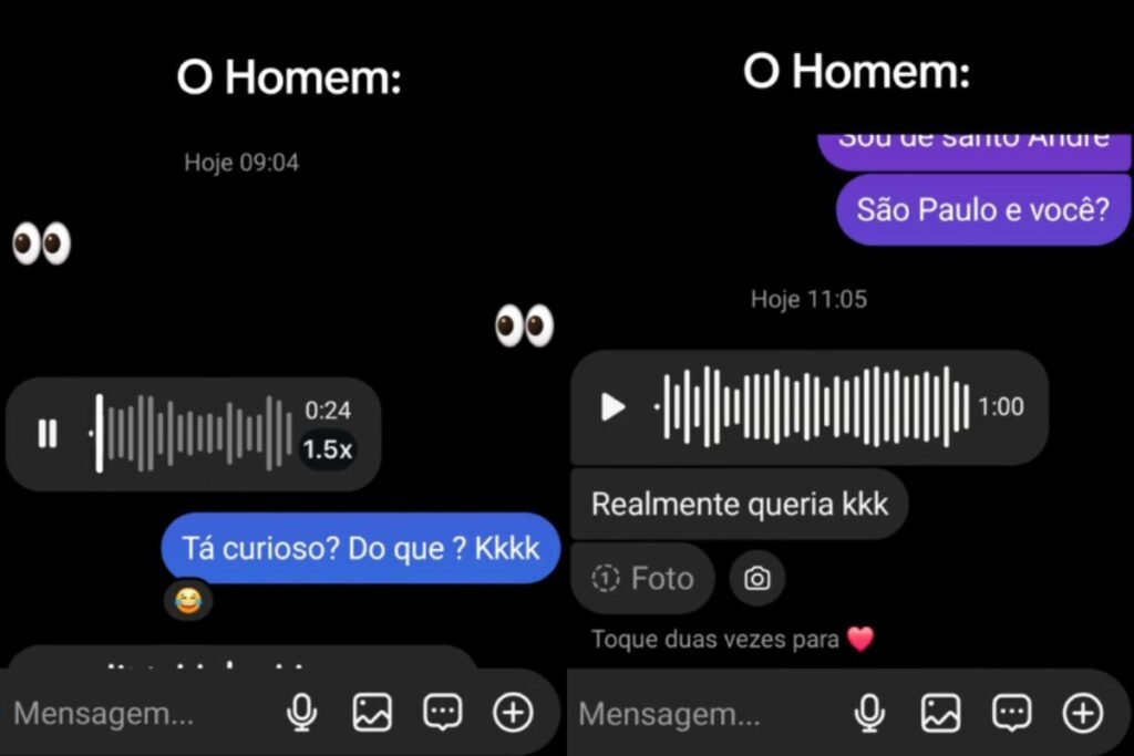 Ingrid, então, perguntou do que ele estava curioso, e o rapaz respondeu: “Isso, faz charminho que eu adoro. Fiquei curioso, mulher, você é da onde?”. A jovem respondeu: “Sou de Santo André, São Paulo. E você?”. Foi aí que a conversa tomou outro rumo.