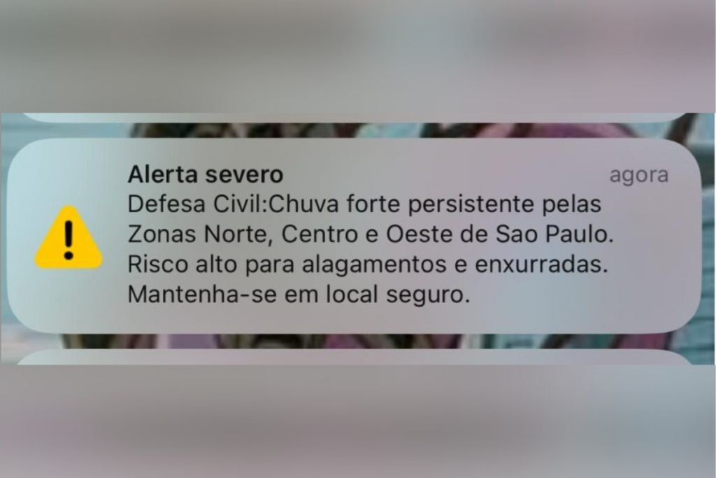 Um dos mais recentes alertas ocorreu na última quinta-feira (6/2), quando foi enviado um aviso de alerta severo para quem estava nas zonas leste, oeste, norte e centro da capital paulista por volta das 19h25.