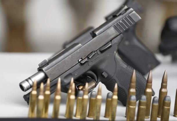 Pistola calibre 9 mm, junto com 50 munições e 4 carregadores