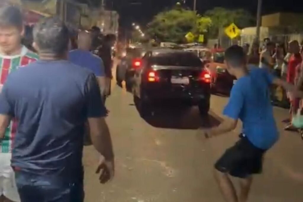 Os frequentadores, então, passaram a jogar objetos no automóvel, momento em que o condutor tentou acelerar para fugir. Veja: