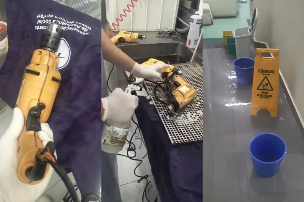 Nos vídeos, é possível ver um funcionário limpando a furadeira com detergente. Há três furadeiras do tipo visíveis na bancada.
